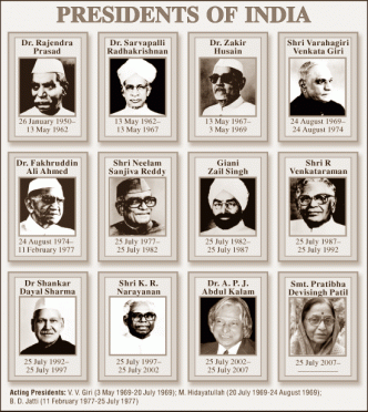 Ḍr. Rājēndra prasāda, Dr. Sarvapallī rādhākr̥ṣṇana, Dr. Jākira husaina, varāhagiri vēṅkaṭagiri (Kāryavāhaka), n’yāyamūrti mōham’mada hidāyatullāha (kāryavāhaka), varāhagiri vēṅkaṭagiri, Phakharuddīna alī ahamada, bī.Ḍī. Jattī (kāryavāhaka), nīlama san̄jīva rēḍḍī, jñānī jaila sinha, āra. Vēṅkaṭaramaṇa,Dr. Śaṅkara dayāla śarmā, kē. Āra. Nārāyaṇana, Dr Ē.Pī.Jē. Abdula kalāma, śrīmatī Pratibhā dēvīsinha pāṭila (janma – 1934).