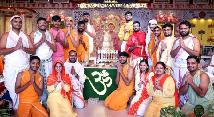 तीर्थंकर महावीर यूनिवर्सिटी, मुरादाबाद में पर्वाधिराज दशलक्षण महामहोत्सव के छठे दिन उत्तम संयम धर्म पर भक्ति की बयार बही। सिद्धार्थ जैन और उनके साथियों की ओर से प्रस्तुत भजनों से रिद्धि-सिद्धि भवन में सैकड़ों श्रावक-श्राविकाएं आस्था के सागर में झूमते नज़र आए। उत्तम संयम धर्म पर सुगंध दशमी के उपलक्ष्य में विशेष पूजन हुआ। रिद्धि-सिद्धि भवन में श्रीजी का प्रथम स्वर्ण कलश से अनन्त चौधरी, द्वितीय स्वर्ण कलश से हितेश जैन, तृतीय कलश से सार्थक जैन और चतुर्थ स्वर्ण कलश से अमन जैन को अभिषेक करने का सौभाग्य मिला। श्रीजी की स्वर्ण कलश से शांतिधारा करने का सौभाग्य मेडिकल कॉलेज के डीन एकेडमिक्स डॉ. एसके जैन और रजत कलश से शांति धारा करने का सौभाग्य सुजल, सोमिल, नमन, हर्ष, वैभव, अर्पित, वंश और ऋषभ जैन को मिला। सभी धार्मिक अनुष्ठानों में कुलाधिपति श्री सुरेश जैन, फर्स्ट लेडी श्रीमती वीना जैन, जीवीसी श्री मनीष जैन, श्रीमती ऋचा जैन, एग्जिक्यूटिव डायरेक्टर श्री अक्षत जैन आदि की गरिमामयी मौजूदगी रही। अष्ट प्रातिहार्य का सौभाग्य अष्ट कन्याओं- हर्षिता जैन, पूर्वा, संचिता, अंशिका, शैवी, डॉली, आस्था और सेजल जैन को मिला। दस दिनी उपवास का संकल्प लेने वाले श्रावक-श्राविकाओं को सम्मानित किया गया। धर्ममय माहौल में तत्वार्थसूत्र जैसे संस्कृत के क्लिष्ट शब्दों वाली रचना के षष्ठम अध्याय को संभव जैन ने रोचक और भावपूर्ण तरीके से वाचन किया।