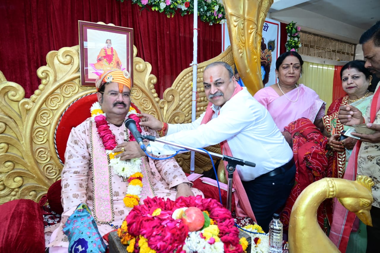 उन्होंने कहा कि भारत वर्श में जन्म लेने वाले भारतवंशी कहलाते हैं। हर हिन्दू के घर में श्रीमद् भागवत होनी चाहिए। हमारे घर में जो भी भगवान विराजमान हों, हमें भगवान के सामने बैठकर कथा सुनानी चाहिए। ठाकुरजी के सामने बैठकर कथा सुनाएंगे तो ठाकुरजी कृपा बरसाएंगे। जहां कथा हो रही है वहीं तो आनंद आता है। हमें कीर्तन करना चाहिए। कीर्तन करते करते भोजन बनाना चाहिए। हमारी बुद्धि का उद्धार होगा। जितना भगवान का नाम लेंगे। शर्म केवल फिल्मी गानों के सुनने में आनी चाहिए। ठाकुरजी के बारे में बात करेंगे तो ठाकुरजी की कृपा बनी रहेगी। आसन ठाकुरजी के सामने लगाना चाहिए। ठाकुरजी के सामने बैठने से सद्बुद्धि प्राप्त होती है। हर सांस पर भगवान का नाम लेना चाहिए। शरीर में सबसे कीमती श्वांस है, जो बहुत मुश्किल से मिलती है। अपनी इन्द्रियों को सुनना चाहिए और इन्द्रियों को जीतना चाहिए। जितने भी नदी पहाड हैं, यह भगवान की आत्मा हैं। पानी में हवन सामग्री नहीं डालनी चाहिए। जल ही जीवन है। भगवान की चाबी धर्म है। कभी भी भगवान को पीछे से प्रणाम नहीं करना चाहिए। पीछे से प्रणम करने वाला अधर्मी होता है। भगवान की कथा सुननी चाहिए। हमारे धर्म में 36 करोड देवी देवता हैं। हमें सभी भगवान की सेवा करनी चाहिए। इतने भगवान हमारे धर्म में है और किसी के पास नहीं है। सनातन धर्म में झूठ का कोई काम नही है। आरती के बाद प्रसाद वितरण किया गया।