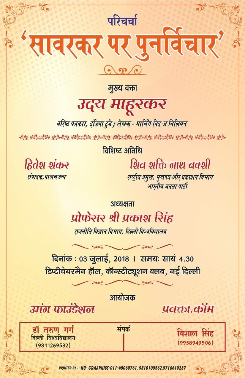 नई दिल्ली : स्वतंत्रता सेनानी और हिन्दू विचार धारा के राजनितिक विनायक दामोदर सावरकर के विचारों को राष्टीय मंच देने के लिए सावरकर पर पुनर्विचार कार्यक्रम का आयोजन किया जा रहा है। यह कार्यक्रम आज शाम 4 : 30 कंस्टीट्यूशन क्लब नई दिल्ली में होगा आप सभी आकर इस कार्यक्रम के भागीदारी बने